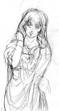 装備と所持品:白いローブ、親の形見のくすんだ真鍮の腕輪、気の精霊を呪付したアミュレット、呪文封印呪付物の指輪二つ、POT14相当の各種治療薬、慢性関節炎のための湿布